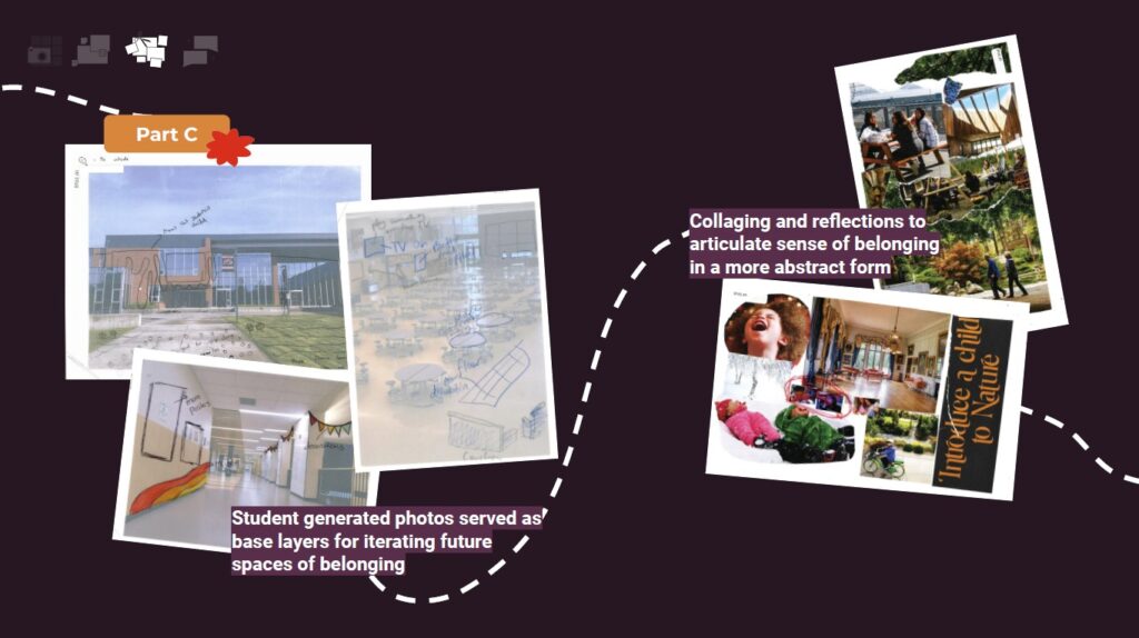A photo-elicitation prompt is followed by a series of activities to understand pluralistic sense of belonging and explore potential design responses. This exploration included sketching and collaging methods that encouraged students to unpack their experiences of belonging and explore potential design outcomes. LEILA JACKSON